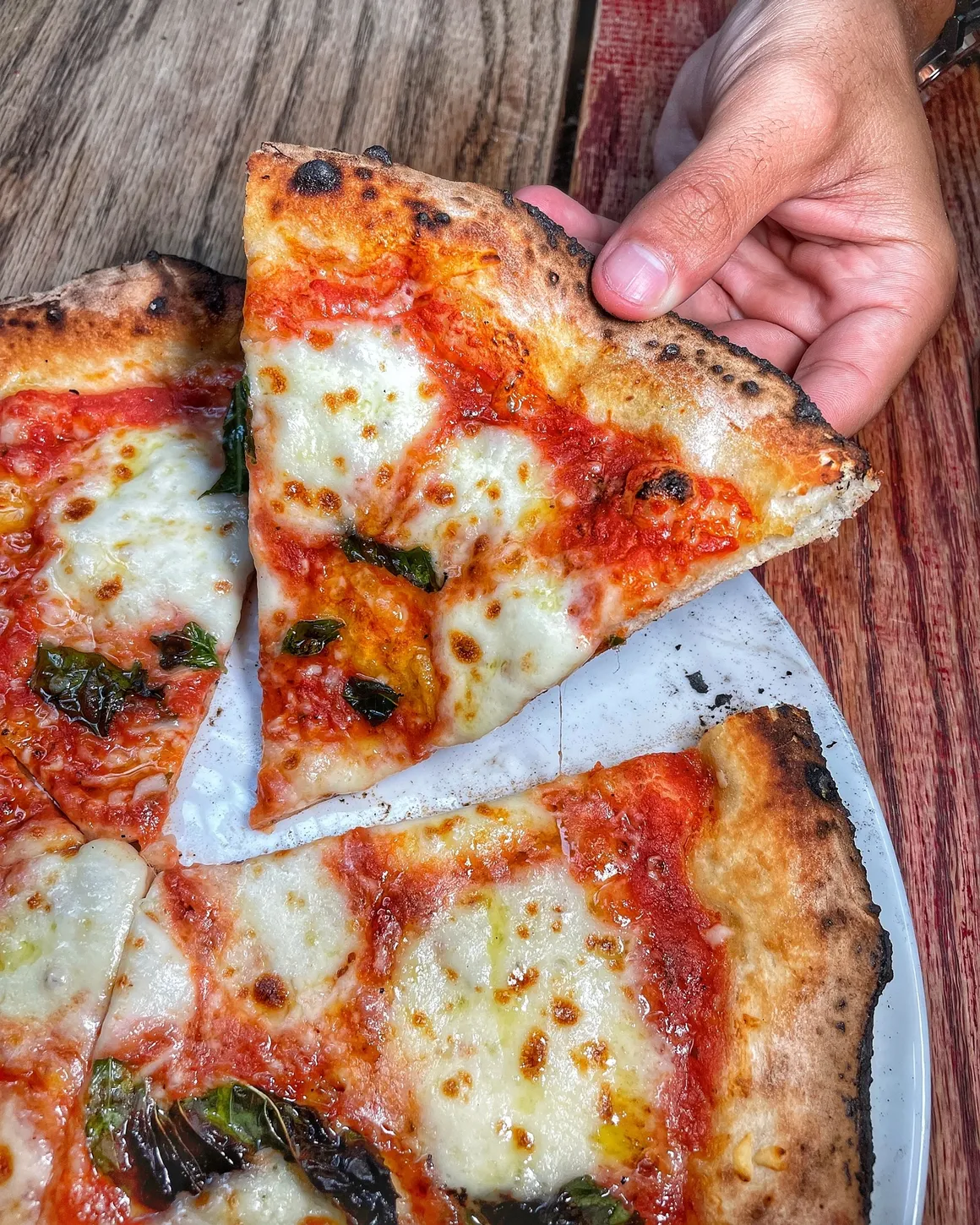 VERA PIZZA NAPOLETANA MADE IN OUR 7000 POUNDS WOOD BURNING OVEN MADE FROM VULCANIC CLAY FROM THE VESUVIO VULCANO.
